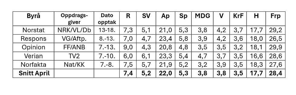 Derfor vil jeg fortsette å justere de rene snittallene, ut i fra de nevnte mønstrene for å gi deg som leser et så godt opinionsbilde som mulig. Mine justerte april-tall finner du i tabellen nedenfor.