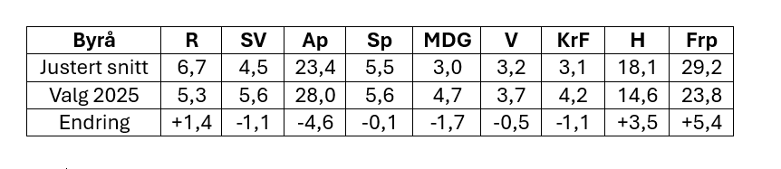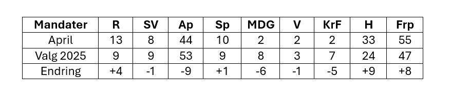 Frp ligger inne med 55 mandater og Høyre med 33 på denne beregningen. Det gir de to blå en samlet økning på 17 målt mot 2025-valget og dermed 88 mandater på Tinget. Man trenger 85 for å ha flertall. Det ville vært historisk, aldri har de to blå partiene sammen hatt rent flertall på Tinget.