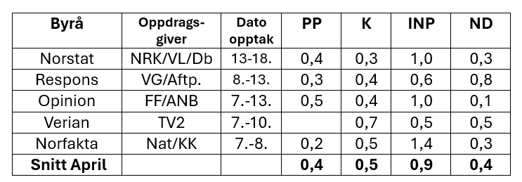 Når det gjelder de andre partiene, så er dataene som vanlig, og dessverre, noe mangelfulle. Men INP måles for tiden høyest av disse på 0,9, mens PP, K og ND følger i sjiktet 0,4-0,5.